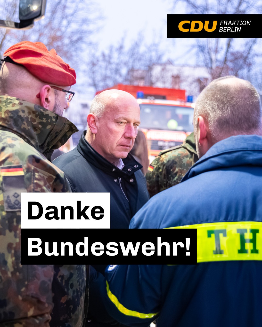 mehr🙏 Danke an die Bundeswehr für die Unterstützung in Steglitz ZehlendorfIm Zuge des massiven Stromausfalls infolge linksextremistischen Terrors leisten unsere Streitkräfte wertvolle Hilfe vor Ort. Auf Bitte des Regierenden Bürgermeisters hat die Bundeswehr frühzeitig und tatkräftig reagiert und unterstützt seit Montagabend im Logistikzentrum des @thw_steglitz die Betankung von Notstromaggregaten. Für diese schnelle und verlässliche Hilfe sind wir als CDU-Fraktion Berlin sehr dankbar.👉 Unser Dank gilt allen Soldatinnen und Soldaten, die in diesen schwierigen Stunden mit Engagement und Professionalität an der Seite der Berlinerinnen und Berliner stehen.Vielen Dank für Ihren Einsatz!